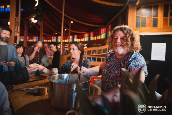 Quoi de plus approprié que le Cannibale Cabaret pour écouter, toutes papilles ouvertes, Antony Cointre disserter sur sa passion pour la cuisine ! Une estrade, des fourneaux, une marmite et un chef en pleine forme, quoiqu’un peu souffreteux de la chaleur du jour. Qu’importe, l’hydratation sauvera notre champion…
